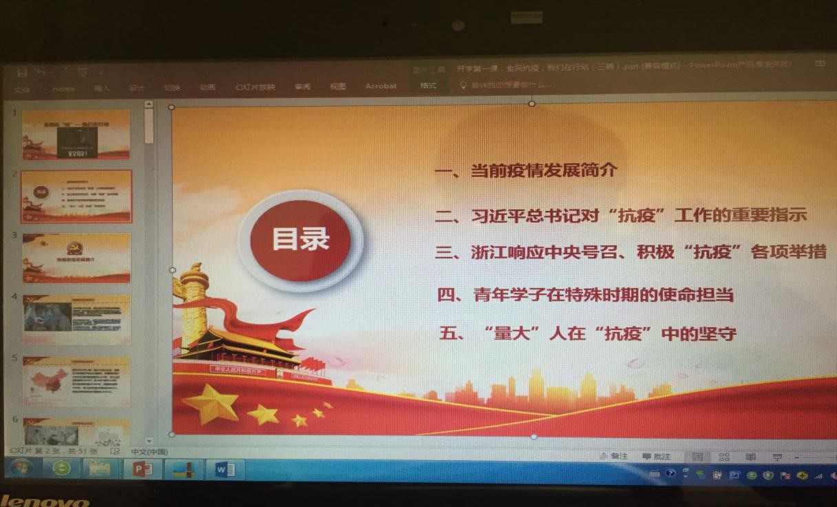 疫情就是命令,防控就是责任,时间就是生命。启动重大突发公共卫生事件一级响应,医护人员争分夺秒从病魔手里抢救生命,建设者不分昼夜建设火神山、雷神山医院,浙江省“一图一码一指数”,“中量大人”在疫情中的坚守等等,在课堂上逐一展示。通过这堂课,同学们更加坚信“中国速度”定能跑赢疫情蔓延,我们一定能赢得疫情防控的人民战争。