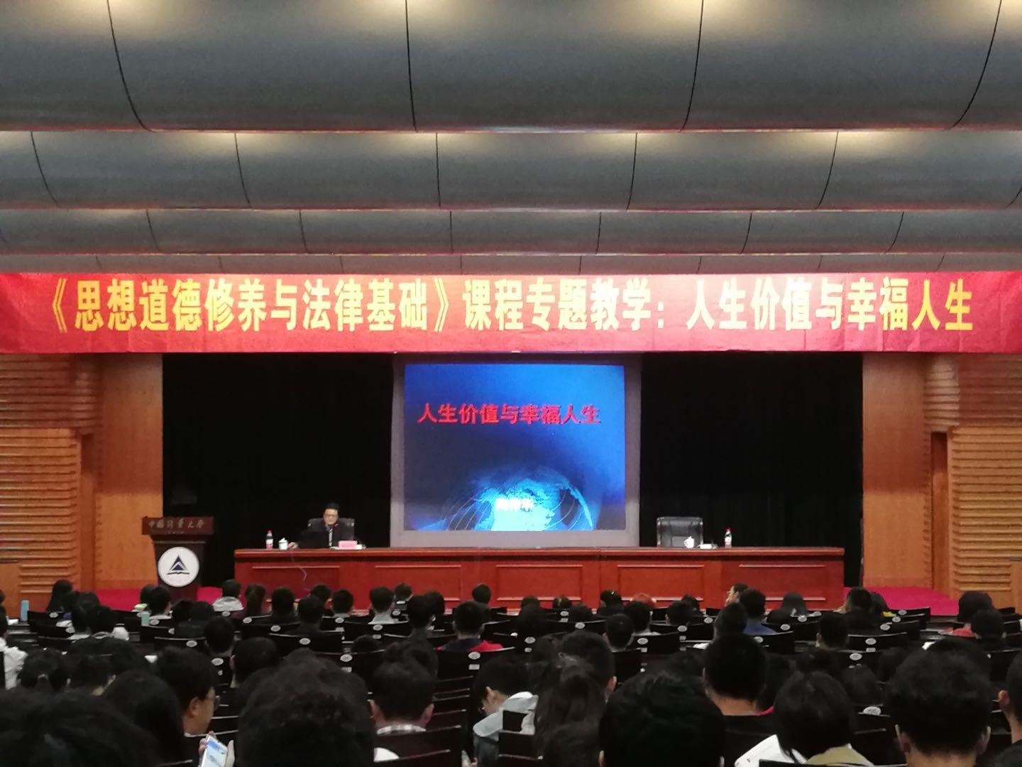 为深入推进习近平新时代中国特色社会主义思想进教材、进教室、进头脑,高标准高质量办好思政理论课,2019年11月13日上午,浙江理工大学党委副书记陶伟华应邀来校,在闻厅二楼报告厅为《思想道德修养与法律基础》课程师生开展了题为“人生价值与幸福人生”的专题教学报告。报告由马克思主义学院院长兰婷教授主持,副院长隋金波、基础课教研室全体教师和2019级260余名学生参加了教学活动。