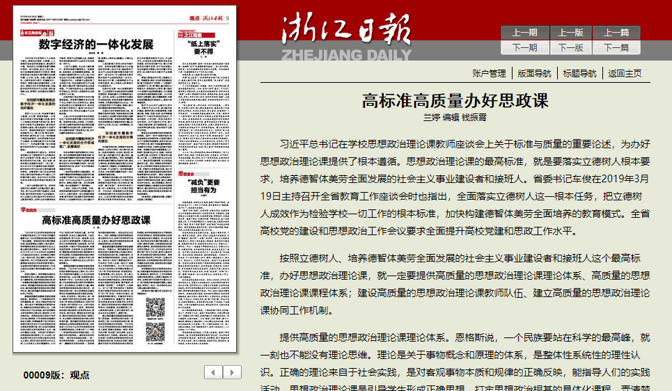 为贯彻落实习近平总书记3月18日在学校思想政治理论课教师座谈会上重要讲话精神,应《浙江日报》理论评论部邀请,我校马克思主义学院院长兰婷教授于4月24日在《浙江日报》发表《高标准高质量办好思政课》的理论文章,系统论述新时代如何办好思想政治理论课。