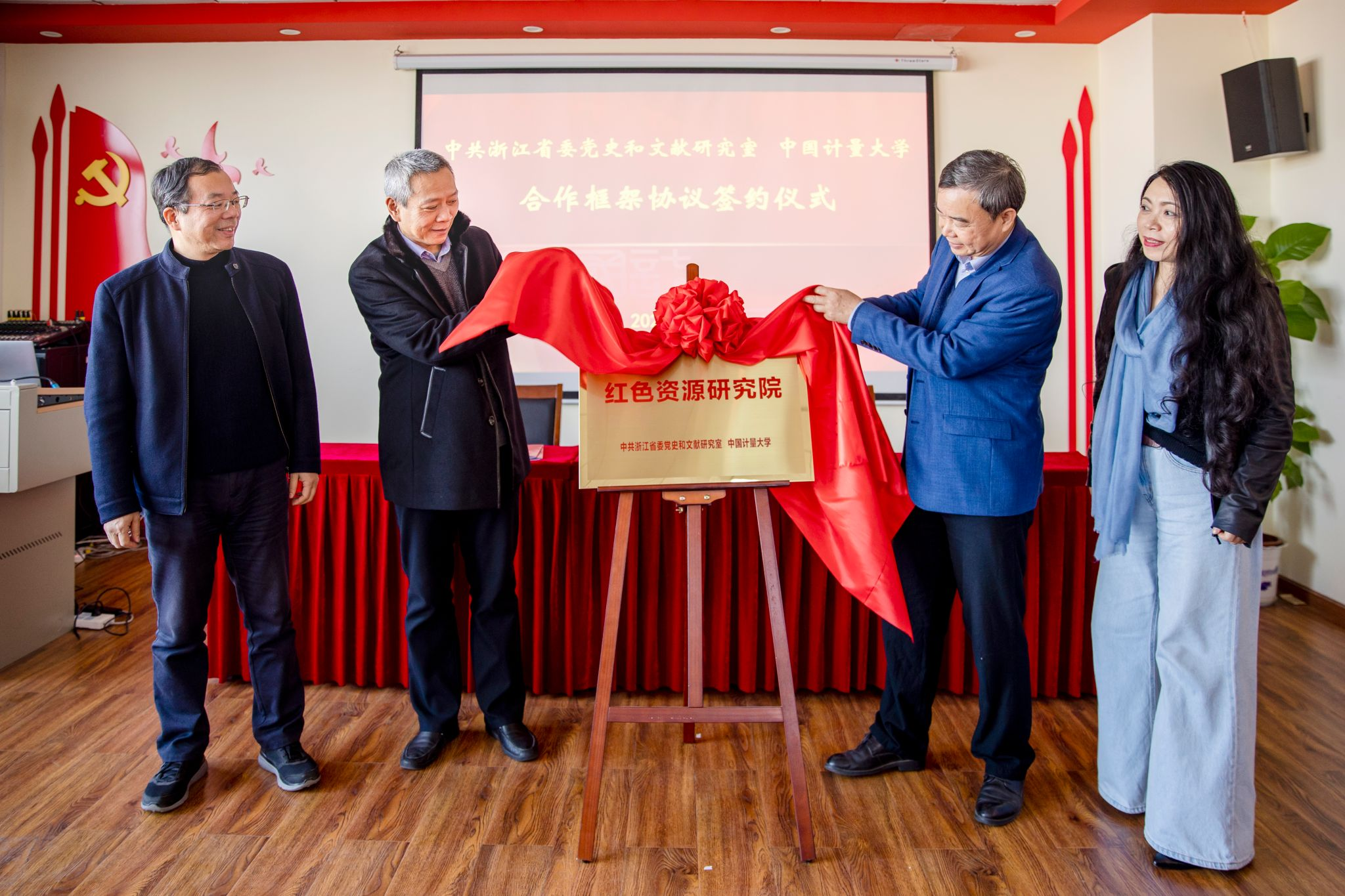 会上进行了“红色资源研究院”揭牌仪式。研究院由中共浙江省委党史和文献研究室和我校共建,共同开展红色资源的研究、开发、利用、保护、教育、传播等工作。