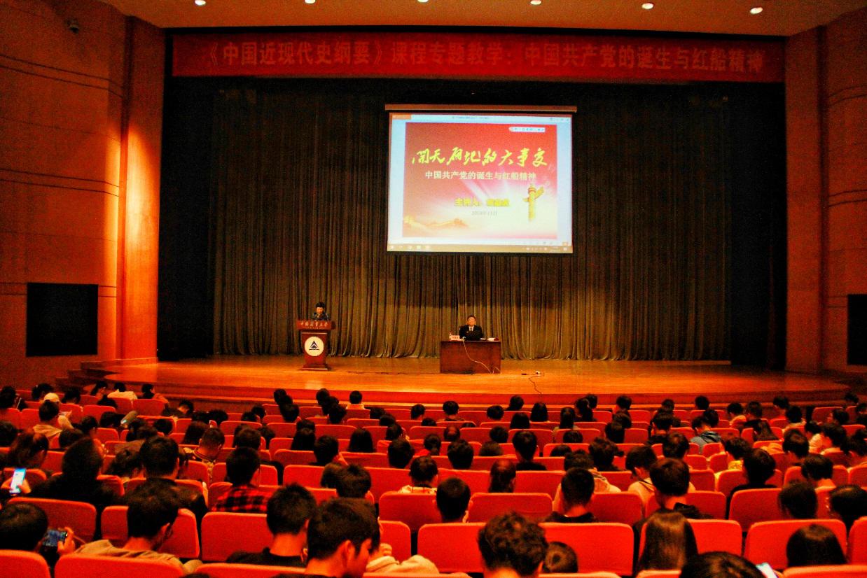 为深入学习习近平新时代中国特色社会主义思想,提升我校思政理论课的实效性,促进思政理论课与教学实践的有效结合,丰富中国近现代史纲要课程教学方式,11月7日下午,应马克思主义学院邀请,中国计量大学原党委书记胡建成教授在我校嘉量大会堂为马院师生、《纲要》课学生作了题为“开天辟地的大事变——中国共产党的诞生与红船精神”的专题讲座。 此次讲座由马克思主义学院党总支书记高岭梅主持。胡建成教授结合党的十九大精神,回顾了中国共产党的诞生和发展,围绕习近平总书记提出的红船精神的内涵,联系中国客观实际,为全体师生奉献了一次精彩的演讲。