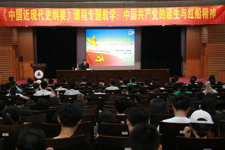2018年5月30日下午,胡建成教授应马克思主义学院邀请在学校闻厅二楼报告厅为中国近现代史纲要课学生进行专题讲授“中国共产党的诞生与红船精神”,本次教学活动由马克思主义学院党总支书记高岭梅主持。