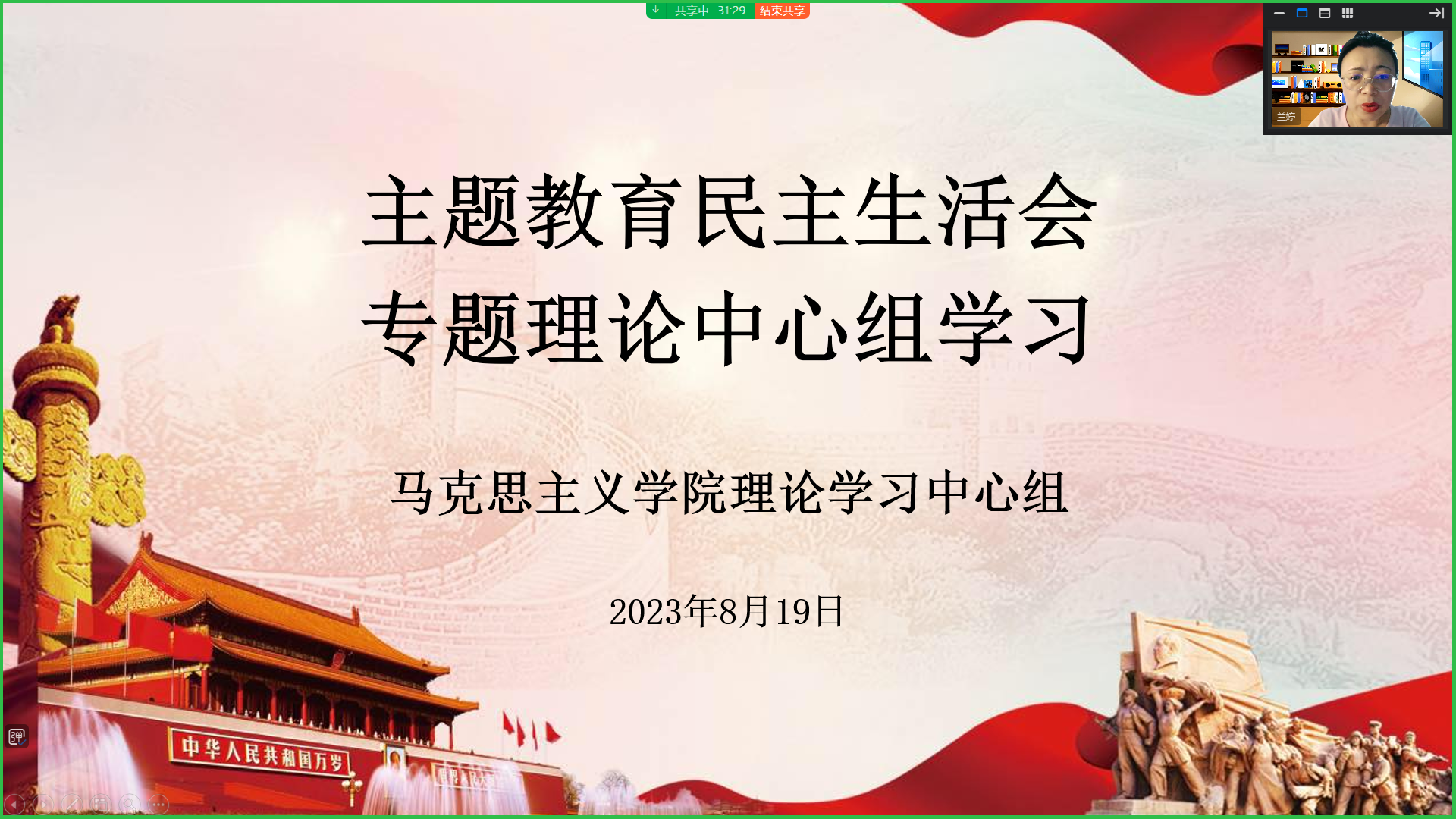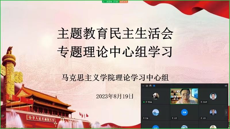 为深入开展学习贯彻习近平新时代中国特色社会主义思想主题教育,为高质量开好专题民主生活会打牢思想基础,8月19日下午,马克思主义学院党委理论学习中心组召开了主题教育民主生活会专题理论中心组学习。学院党政领导、院党委委员、纪委委员、教工党支部书记、教研室主任等参加会议。本次会议采用线上学习的方式,中心组成员分别围绕学习主题作领学发言,会议由学院党委书记兰婷主持。