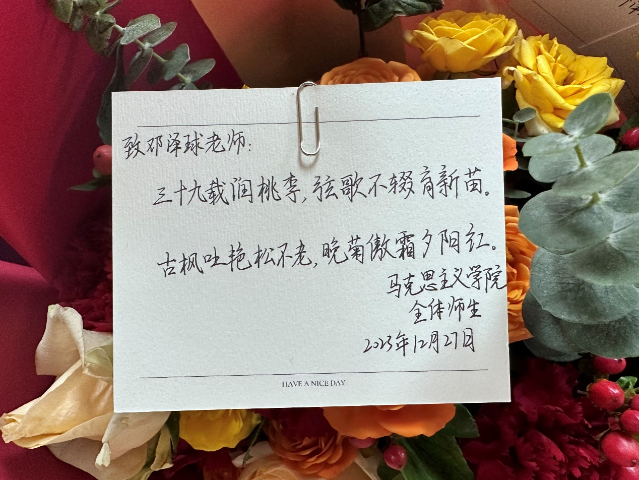 隋金波回顾了邓泽球老师的求学、工作经历,高度评价了邓老师为学院发展所做的积极贡献。伴随着热烈的掌声,学院研究生代表为邓泽球老师献上鲜花和贺卡,并致以诚挚敬意。邓泽球老师饱含深情地发表了退休感言:“教书育人,尚德乐业,三尺讲台一只粉笔绘出满园桃李写尽悠悠诗魂;博学善教,万般嘱托,千根华发举起神州栋梁点亮漫漫人生。”随后,学院师生代表与邓泽球老师合影留念,为邓泽球老师的“最后一课”画上圆满句号。