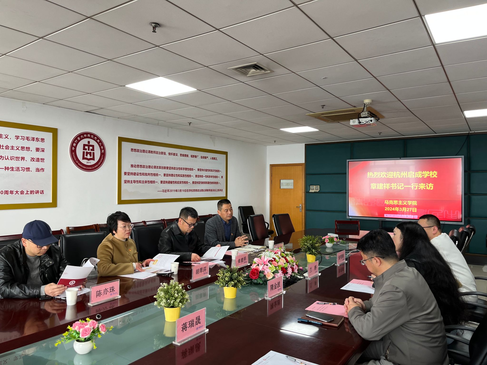 3月27日,杭州启成学校党委书记、校长章建祥,党委副书记程光忠,副校长胡翠萍和办公室主任陈亦珠等一行来我校马克思主义学院参观交流。学院党委书记兰婷、副院长隋金波参加本次会议。