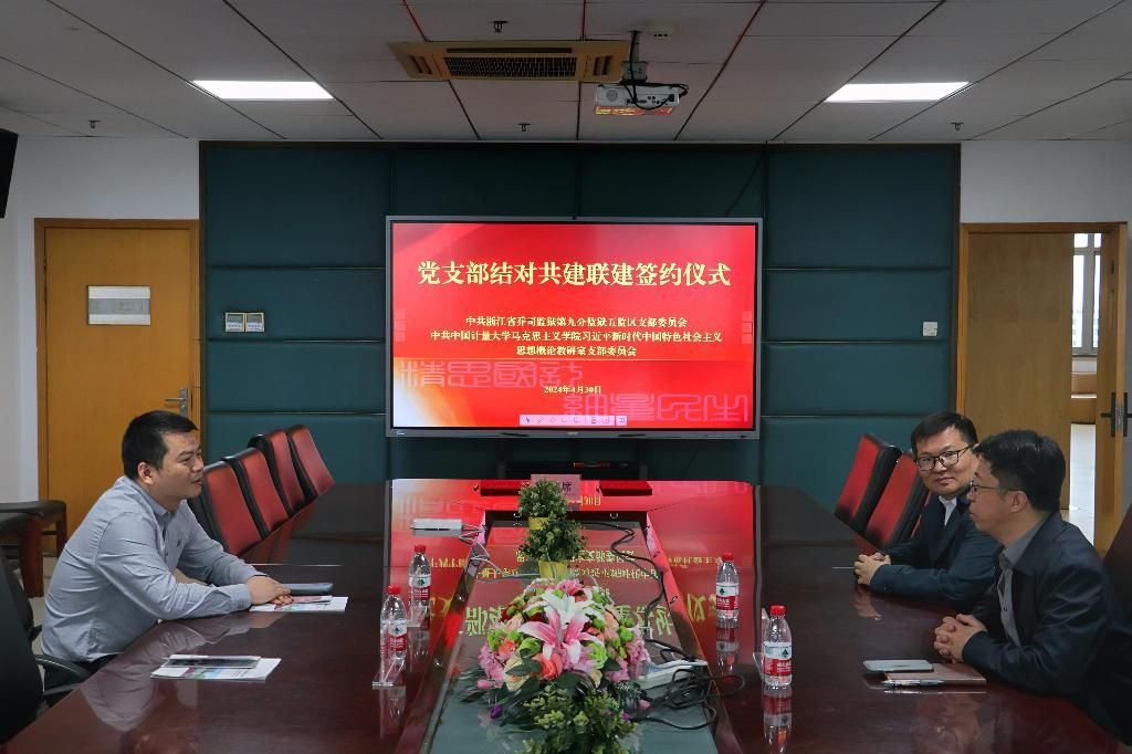 为扎实推进党纪学习教育,提高师生党员纪律意识,提高学院党建工作的影响力和辐射面,4月30日下午,马克思主义学院习近平新时代中国特色社会主义思想概论教研室党支部与浙江省乔司监狱第九分监狱五监区党支部开展党支部结对共建联建活动,双方共同签署了党支部结对共建联建协议。马克思主义学院副院长、习近平新时代中国特色社会主义思想概论教研室党支部书记隋金波,党委副书记周凯,浙江省乔司监狱第九分监狱五监区党支部书记叶文明出席签约仪式,双方党支部成员参加共建活动,签约仪式由周凯主持。