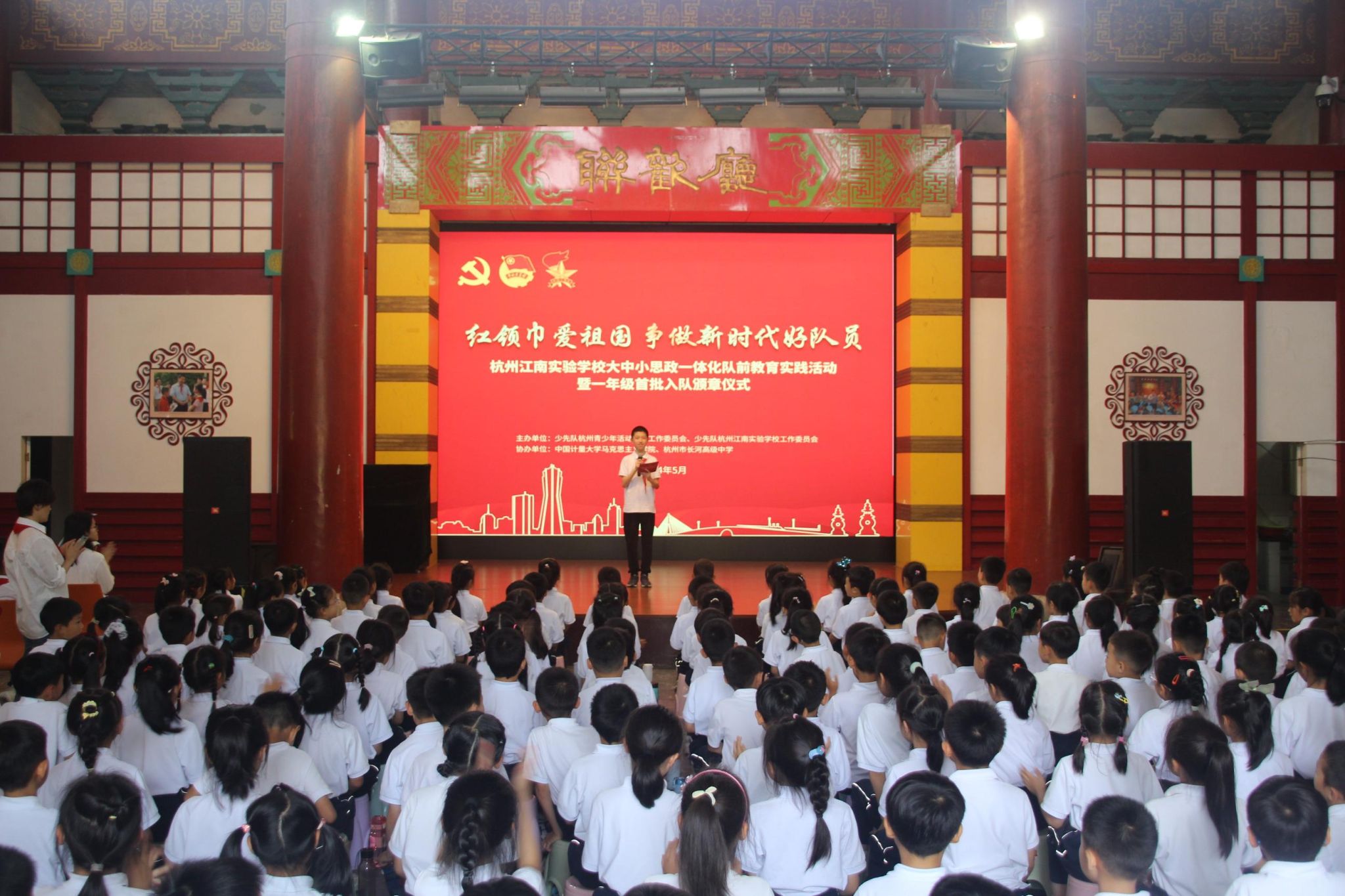 “星星火炬,照亮未来。”为深入推进大中小学思想政治教育一体化建设,5月24日下午1点,杭州江南实验学校联合中国计量大学马克思主义学院、杭州市长河高级中学共同开展“红领巾爱祖国 争做新时代好队员”主题活动。杭州市少先队总辅导员孙怡,杭州江南实验学校党委书记唐伯范,马克思主义学院青年团干部李天竹、研究生党员代表李涵,杭州市长河高级中学团委书记孙卉姿及杭州江南实验学校师生代表共计200余人参加仪式。