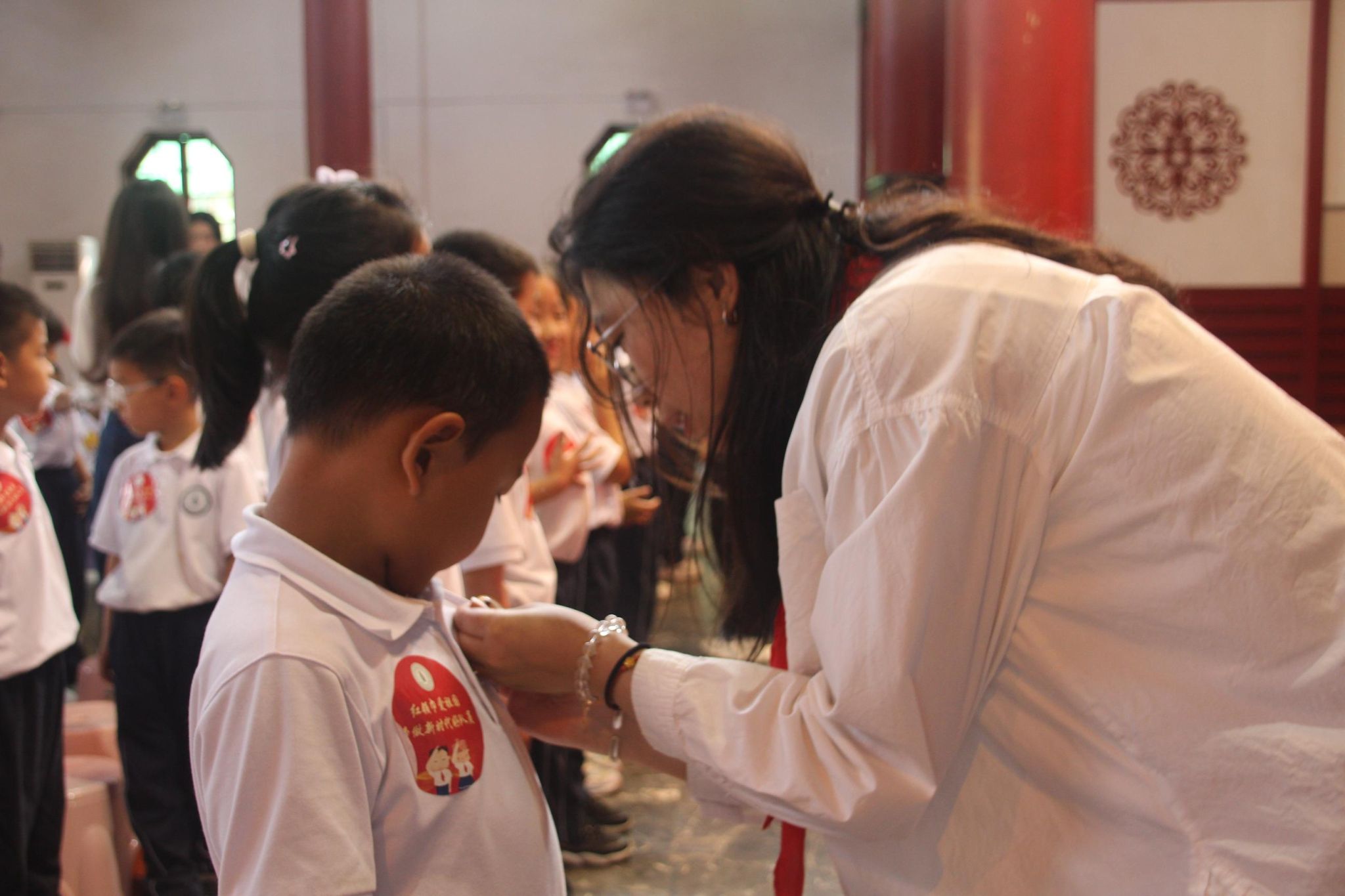 中国少年先锋队是如何成立的?红领巾的由来和含义又是什么?学院“00后”研究生党员代表李涵在杭州青少年活动中心红领巾广场为首批入队的166名队员带来一堂生动的队前教育课,用劳动童子团和红领带的感人故事引导小朋友们自觉传承红色基因,播撒信念种子。