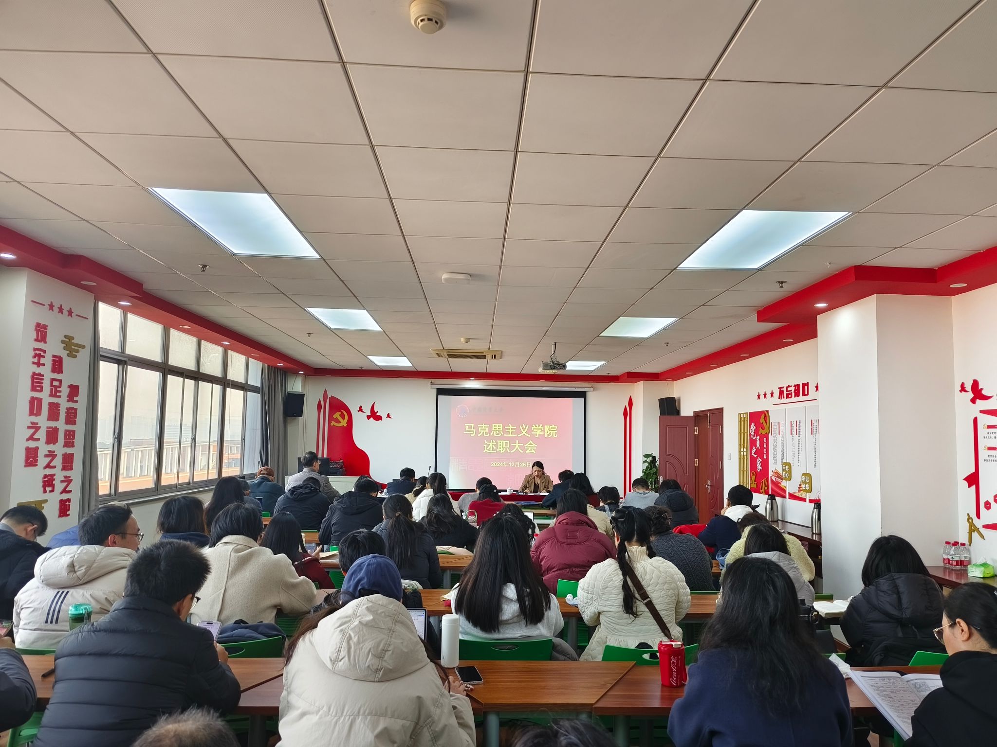 12月25日上午,马克思主义学院在图书馆7楼传播中心会议室召开党政班子述职大会暨全体教职工大会。校党委副书记程刚到会指导。会议由学院党委书记兰婷主持,学院领导班子、全体教职工和部分学生代表参加会议。
