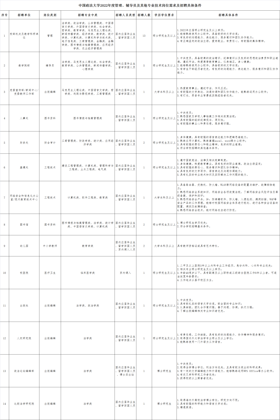 根据中国政法大学2022年度招聘计划及相关规定,现就本校管理、辅导员及其他专业技术岗位面向社会公开招聘事业编制人员事宜公布如下: