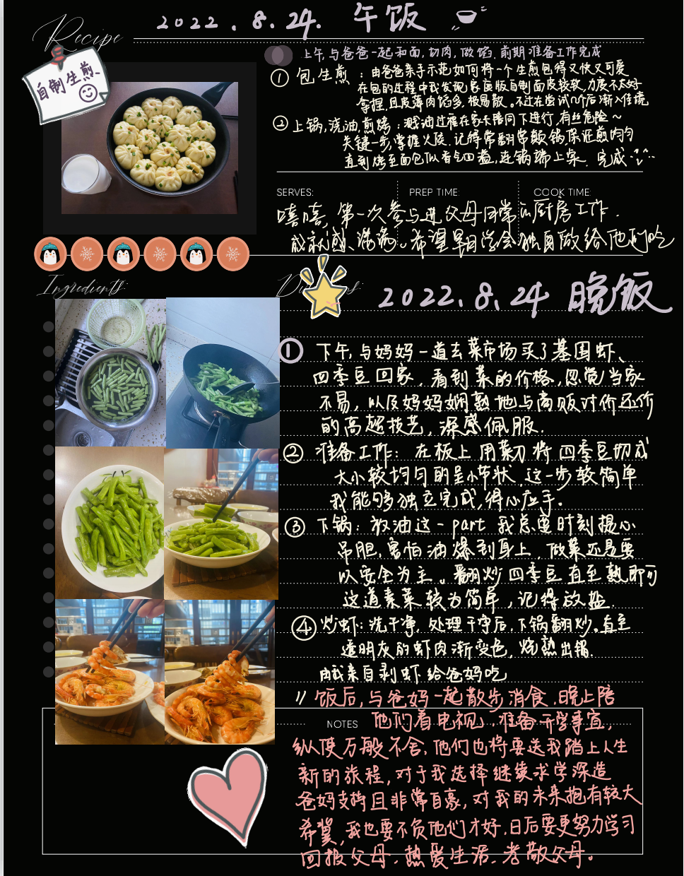 忆感恩,最是家中烟火气。打开这份感恩作业,同学们纷纷用一道家常的西红柿炒鸡蛋、一份美味的甜品、一道拿手的可乐鸡翅、一碗家乡的特色鱼面、离家远行前的一顿饺子等美味饭菜来表达自己浓浓的感恩之情。“一粥一饭,柴米油盐,在厨房的烟火气里,那是家的味道,也是我向父母表达感恩的方式。”2022级研究生叶温纯说到。“菜的味道由做菜人的心境决定,在饭菜中倾注了对家人的感恩之情,让我更加珍惜平凡日子里的幸福。”2020级研究生方红梅如是说到。此外,也有同学用书写一份家书、参与一次家务等方式完成这份感恩作业。