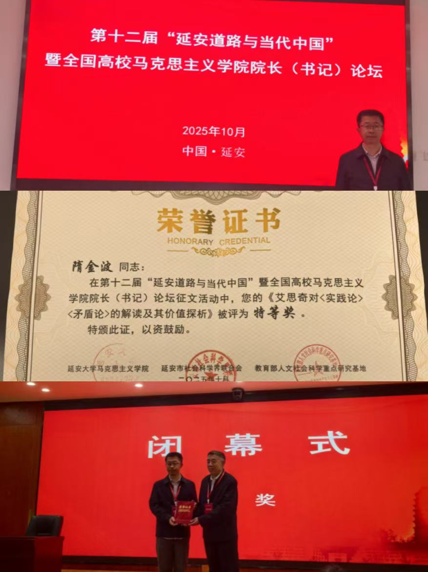 马克思主义学院隋金波教授参会并在会上做“艾思奇对《实践论》《矛盾论》的解读及其价值探析”主题发言。论坛共收到论文300余篇,经专家评审评出特等奖5篇、一等奖10篇、二等奖20篇、三等奖50篇以及优秀奖若干篇。隋金波教授的论文荣获特等奖。